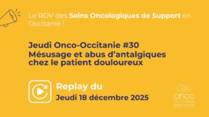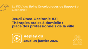 Les Jeudis Onco-Occitanie réunissent les professionnels de santé autour de thématiques liées aux soins oncologiques de support. Ces webinaires d’une heure permettent à un ou plusieurs expert(s) de présenter un sujet et offrent un temps d’échanges entre participants et intervenants.